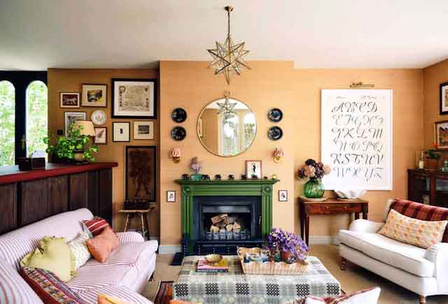 Suelos, sofá, chimenea con repisa, color de las paredes, alfombras, cuadros al óleo, mesa, sillas, estanterías y más ….
